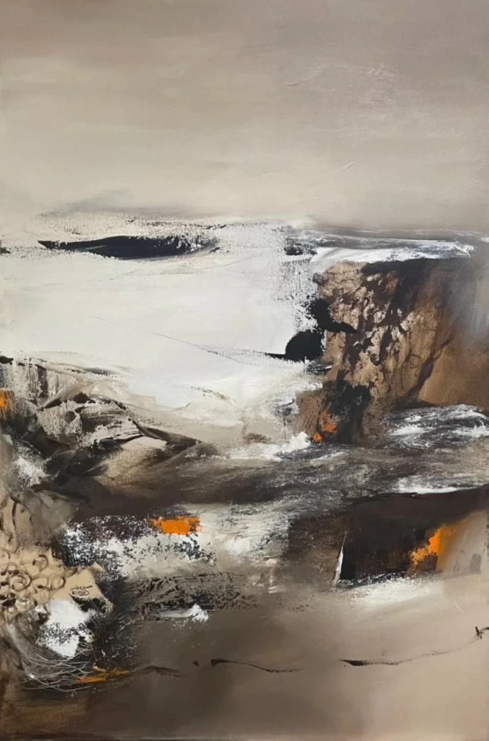 في فضاء المعرض تتنفس اللوحات ببطء وكأنها حالات وجدانية تتبدل بتبدل الضوء. تهمس تدرجات الرمادي والأبيض بالسكينة بينما تشتعل البقع البرتقالية كلحظة دفء مفاجئة في برد المساحات في حين تتناثر الأخضر والبنفسجي بتوازن روحي يشي بالصفاء. اللون هنا ليس عنصرا زخرفيا بل كائن حي ينطق بلغة المشاعر يروي ما عجزت الكلمات عن قوله ويمنح المتلقي دهشة الاكتشاف الأولى.