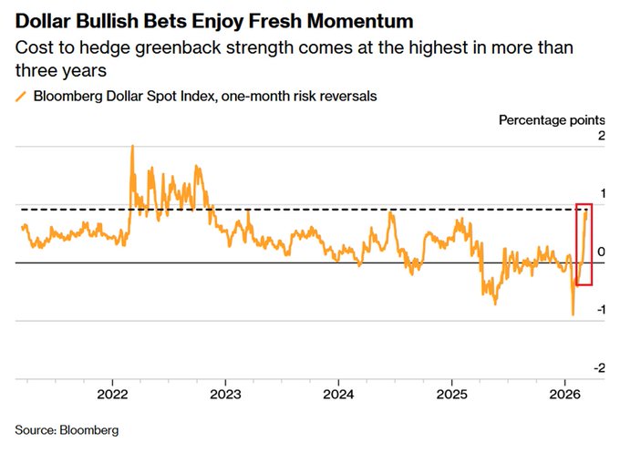 ويُعد هذا التحول لافتًا في ظل أن المؤشر نفسه كان يسجل نحو -90 نقطة أساس في يناير الماضي، وهو ما يمثل أحد أسرع التحولات المسجلة في معنويات السوق خلال فترة زمنية قصيرة. ويعني ذلك أن المتداولين أصبحوا يدفعون الآن أعلى علاوة سعرية منذ أكثر من ثلاث سنوات مقابل الرهانات على ارتفاع الدولار الأميركي.