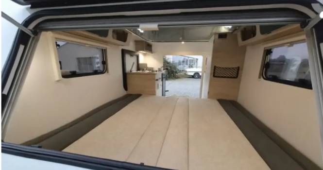 كما يمكن دمج المقاعد لتحويلها إلى سرير كبير يتسع لثلاثة أشخاص، ما يجعل القافلة مناسبة للأزواج أو حتى لعائلة صغيرة.