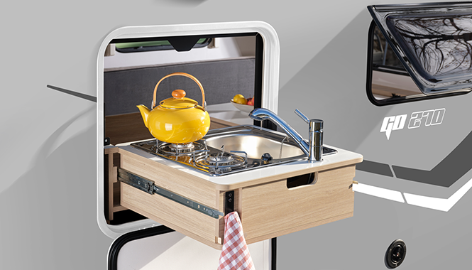 المطبخ داخل “غو 300” صغير لكنه متكامل نسبياً، إذ يضم موقد غاز ثنائي الشعلة مع حوض للغسيل، إضافة إلى ثلاجة ضاغطة بسعة 70 لتراً مع حجرة تجميد صغيرة.